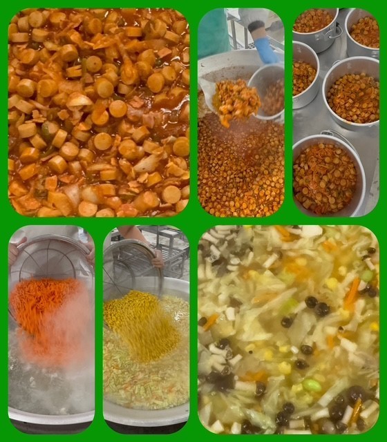 「スープ」は、鶏肉、キャベツ、にんじん、コーン、しめじ、彩りにむき枝豆を使用し、塩、こしょう、薄口しょうゆ、チキンブイヨンで味つけします。