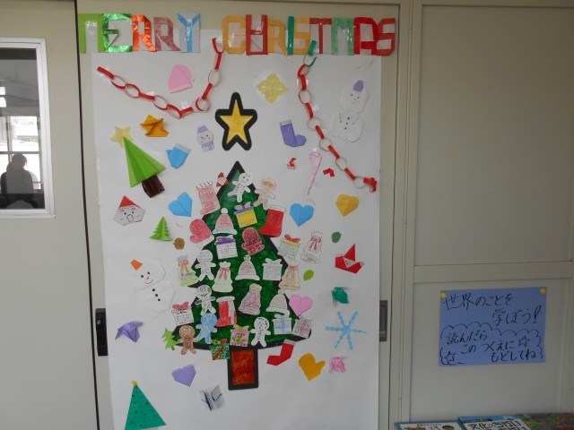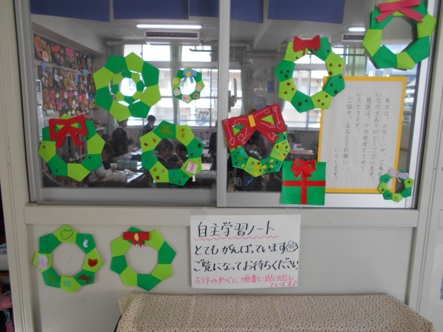 3年生の教室の窓や扉に、クリスマスツリーとリースの掲示物が飾られています。