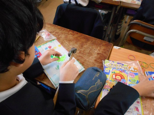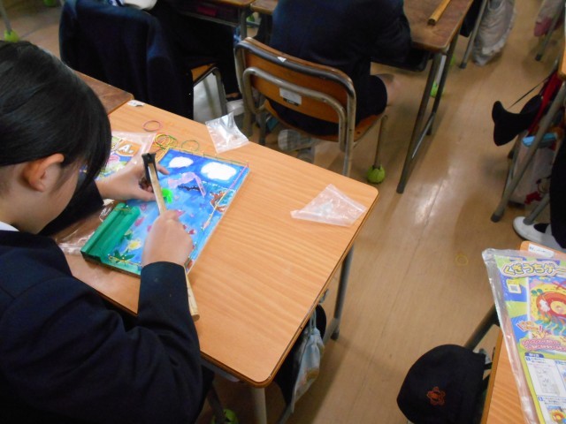 木の板にくぎを打って、ビー玉を転がして楽しむゲームを作っています。