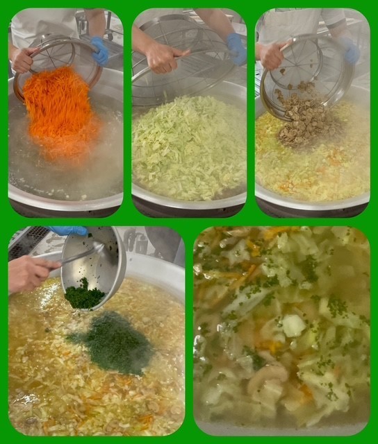 「スープ」は、鶏肉、キャベツ、にんじん、マッシュルーム、彩りにパセリを使い、塩、こしょう、薄口しょうゆ、チキンブイヨンで味つけします。