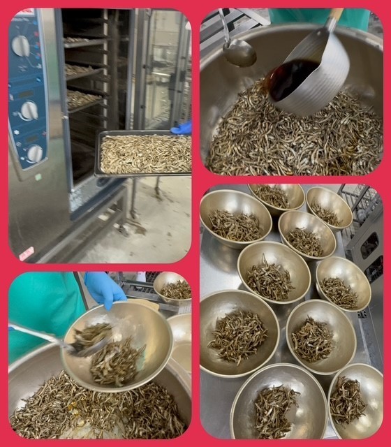 「ごまめ」は、かたくちいわしのにぼしである【かえり】を焼き物機で焼き、砂糖、みりん、濃口しょうゆを煮つめ、配缶時にかえりにからませます。
