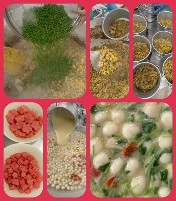 「ぞう煮」は、鶏肉、白玉もち、さといも、だいこん、なにわの伝統野菜の金時にんじん、みつばを使用します。かつお節でだしをとり、白みそを多く使った関西風のぞう煮です。お花型のラッキーにんじんが入っています。