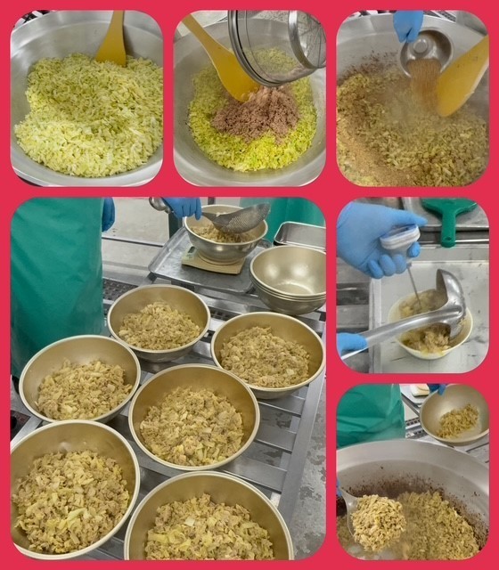 「ツナとキャベツのごまいため」は、ツナ、キャベツを炒め、塩で味つけし、最後にいりごまを加えて炒めます。