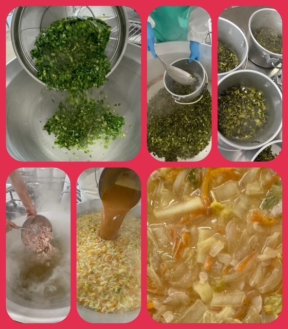 「こまつなっ葉めし」は、ボイルしたこまつなをごま油で炒め、砂糖、薄口しょうゆで味つけし、最後にいりごまを加えて炒めます。配食時に盛りつけたごはんに添え、喫食時に「きざみのり(袋)」をかけていただきます。