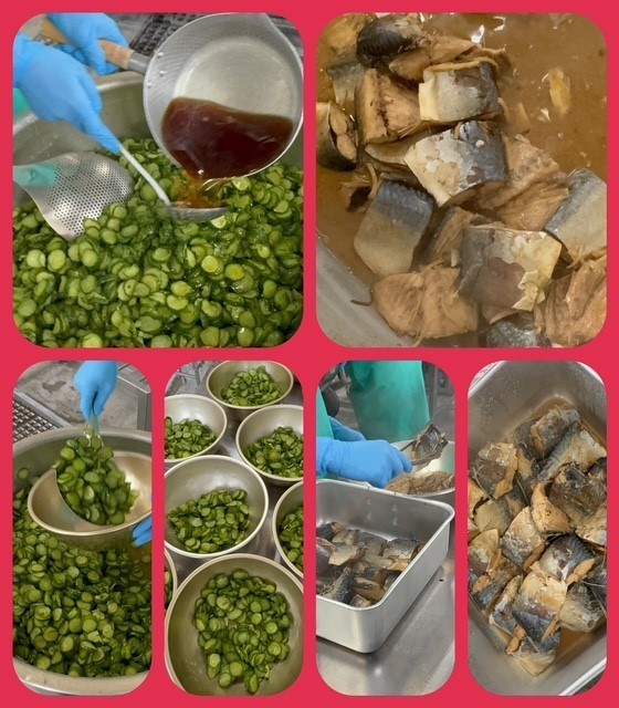「さばのみそ煮」は、釜にだしこんぶを敷き、さば(骨付き)、水、しょうが、砂糖、みりん、赤みそを加えて煮含めます。