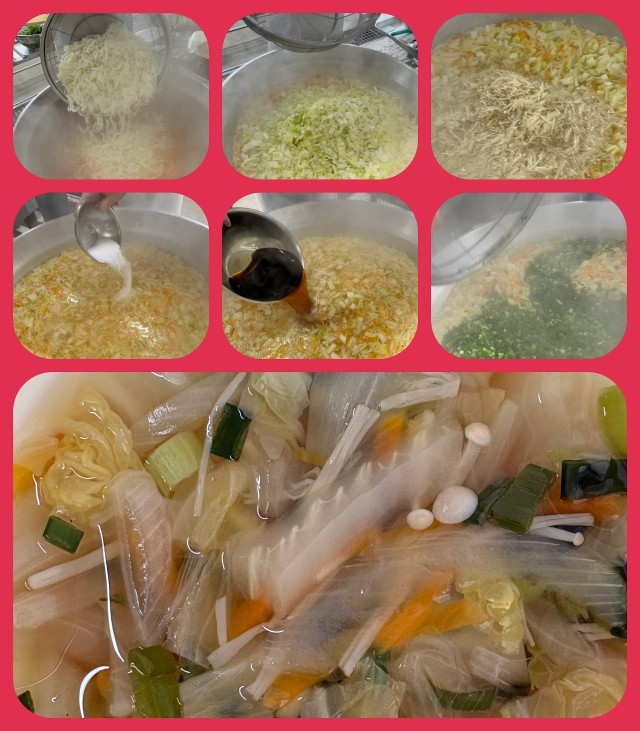 「五目汁」は、だしこんぶとけずりぶしで取っただしに、はくさい、たまねぎ、にんじん、えのきたけ、青ねぎを加えて煮、塩、薄口しょうゆで味つけします。