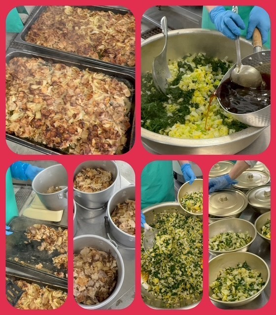 「豚肉のスタミナ焼き」は、豚肉に にんにく、砂糖、濃口しょうゆ、白みそで下味をつけ、たまねぎを混ぜ合わせ、焼き物機で焼きます。