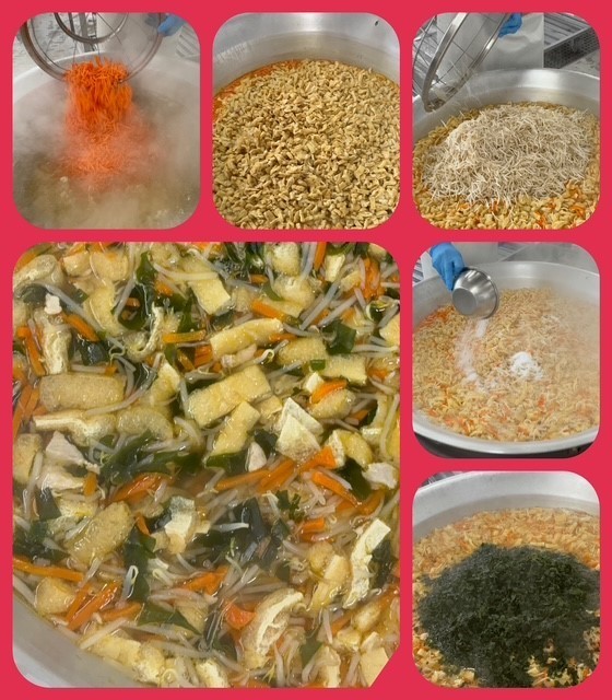 「五目汁」は、だしこんぶとけずりぶしで取っただしに、鶏肉、うすあげ、もやし、にんじん、わかめを加え、塩、薄口しょうゆで味つけします。