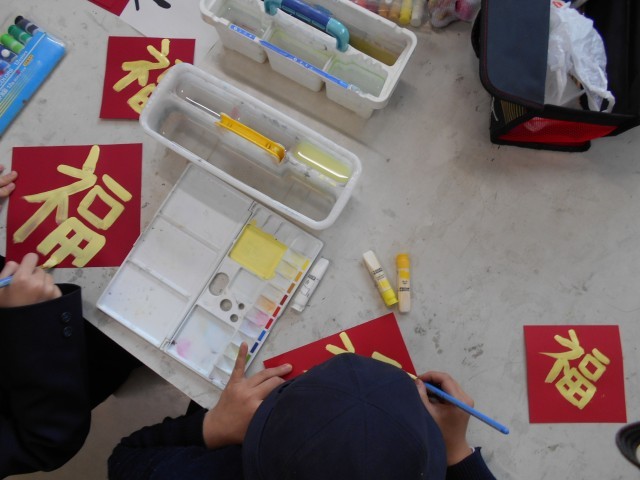 家や教室に飾る「倒福」をつくりました。