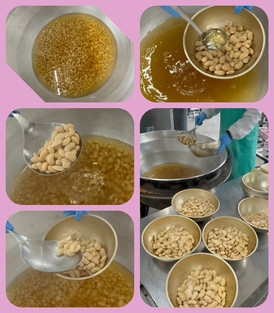 「白花豆の煮もの」は、釜で白花豆を柔らかくなるまで弱火で煮、砂糖、塩、薄口しょうゆで味つけし、煮含めます。