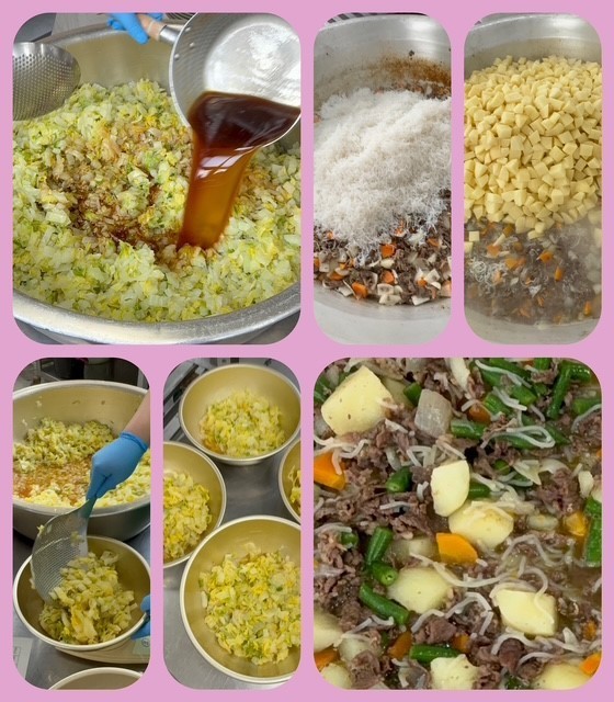 「肉じゃが」は、牛肉、じゃがいも、糸こんにゃく、たまねぎ、にんじん、青みにさんどまめを使用し、砂糖、みりん、塩、薄口しょうゆ、濃口しょうゆで味つけします。