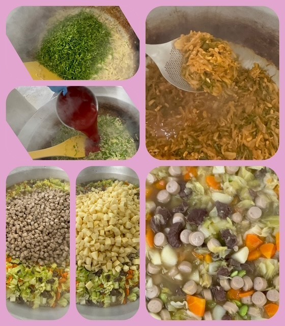「ポトフ」は、牛肉(角・肩ロース)、ウインナー、じゃがいも、キャベツ、にんじん、青みにむき枝豆を使用し、塩、こしょう、薄口しょうゆ、チキンブイヨンで味つけします。