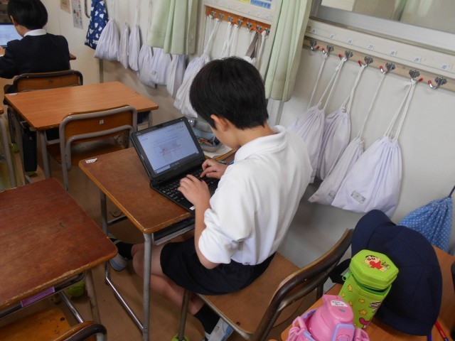 4年生の教室をのぞくと、課題が早く終わった人が、タイピングの練習をしている様子が見られました。