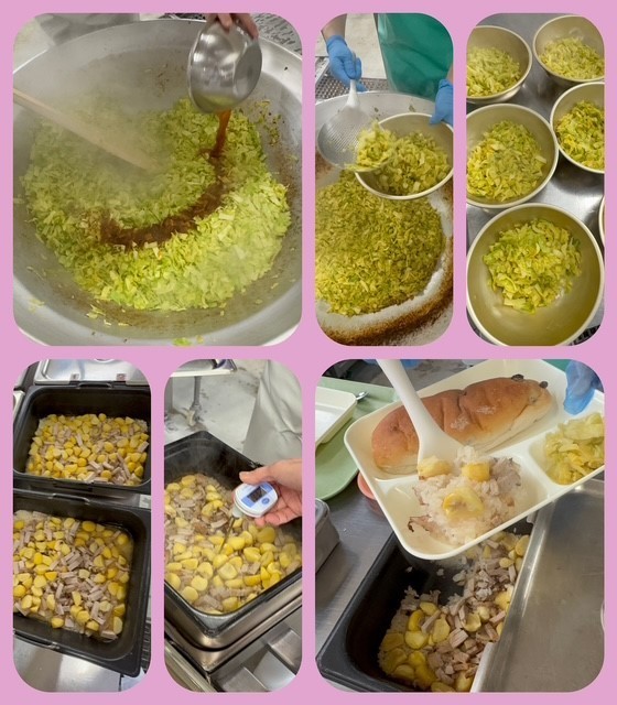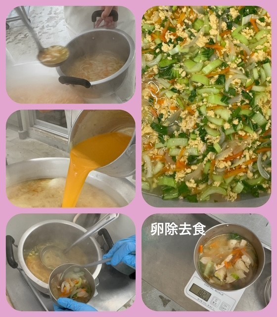 「卵スープ」は、鶏肉、たまねぎ、チンゲンサイ、にんじん、鶏卵(液卵)を使用し、塩、こしょう、薄口しょうゆ、中華スープの素で味つけします。この献立は卵除去食の対応献立です。