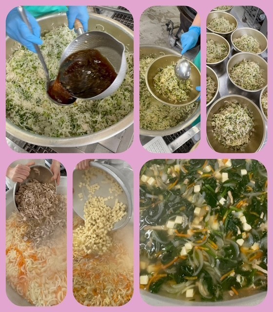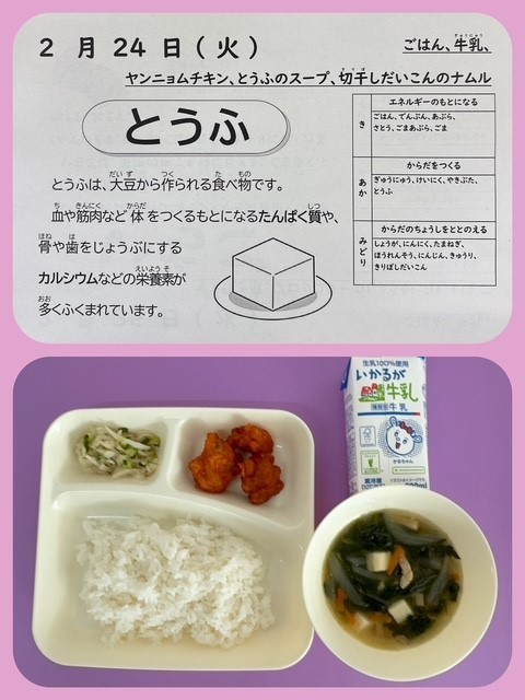 「とうふのスープ」は、焼き豚、とうふ、たまねぎ、ほうれんそう、にんじんを使用し、塩、こしょう、薄口しょうゆ、中華スープの素で味つけします。