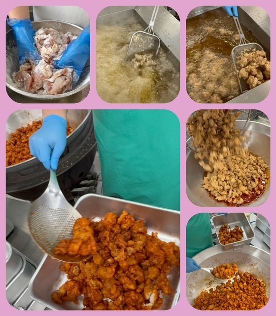 「ヤンニョムチキン」は、鶏肉にしょうが汁、にんにく、料理酒で下味をつけ、でん粉をまぶしてなたね油で揚げ、みりん、濃口しょうゆ、ケチャップ、コチジャンで作ったタレをからませます。