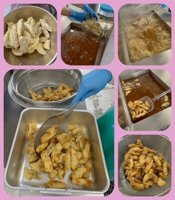 「白身魚フリッター」は、冷凍のまま170度のなたね油で揚げます。