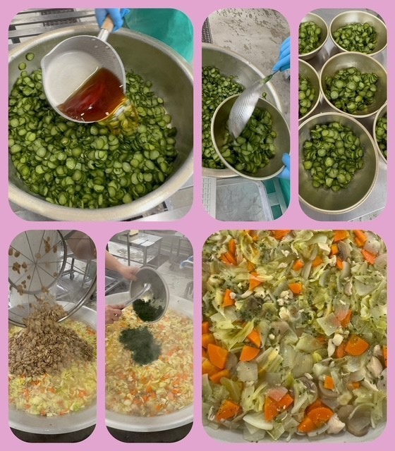 「スープ煮」は、鶏肉、キャベツ、たまねぎ、にんじん、マッシュルーム、彩りにパセリを使用し、塩、こしょう、薄口しょうゆ、チキンブイヨンで味つけします。