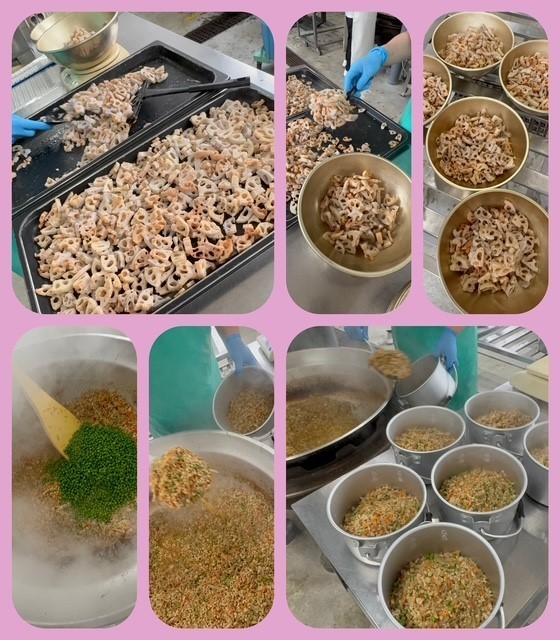 「鶏ごぼうご飯」は、しょうが汁で下味をつけた鶏ひき肉、つきこんにゃく、ごぼう、にんじん、グリンピースを使用し、だし汁に、砂糖、塩、濃口しょうゆで味つけします。きざみのり(袋)が、1人1袋ずつ付いています。配食時にごはんを盛りつけた上に具ときざみのりをかけ、喫食時に混ぜ合わせていただきます。