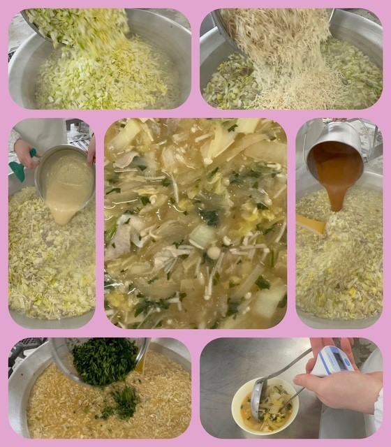 「みそ汁」は、豚肉、はくさい、たまねぎ、えのきたけ、青みにだいこん葉を使用しています。