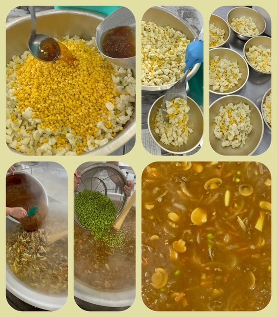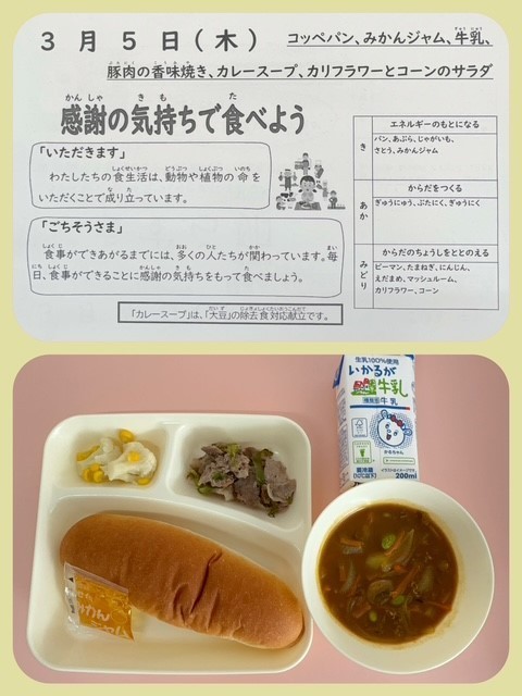 「カレースープ」は、牛肉、じゃがいも、たまねぎ、にんじん、マッシュルーム、彩りにむき枝豆を使用し、塩、チキンブイヨン、カレールウの素(米粉)で味つけします。