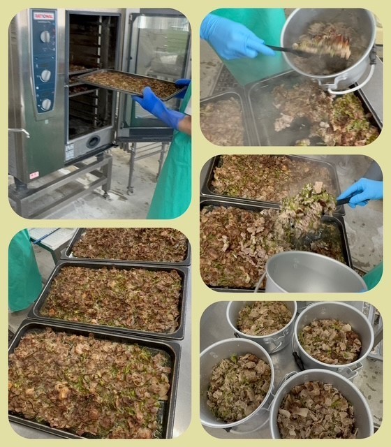 「豚肉の香味焼き」は、豚肉にワイン、塩、こしょう(粗挽)、オールスパイス、ウスターソース、綿実油で下味をつけ、ピーマンを混ぜ合わせ、焼き物機で焼きます。