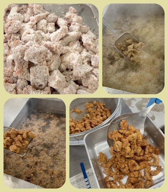 「豚肉のたつたあげ」は、しょうが汁、料理酒、濃口しょうゆで下味をつけた豚肉にでん粉をまぶし、熱したなたね油で揚げます。