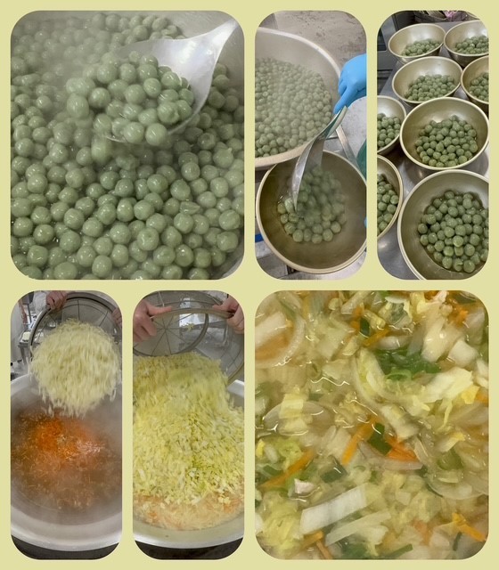 「五目汁」は、だしこんぶとけずりぶしで取っただしに、鶏肉、はくさい、たまねぎ、にんじん、青ねぎを加えて煮、塩、薄口しょうゆで味つけします。