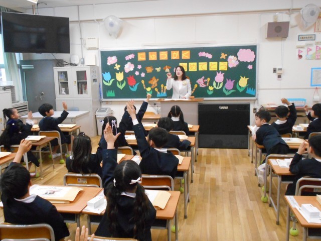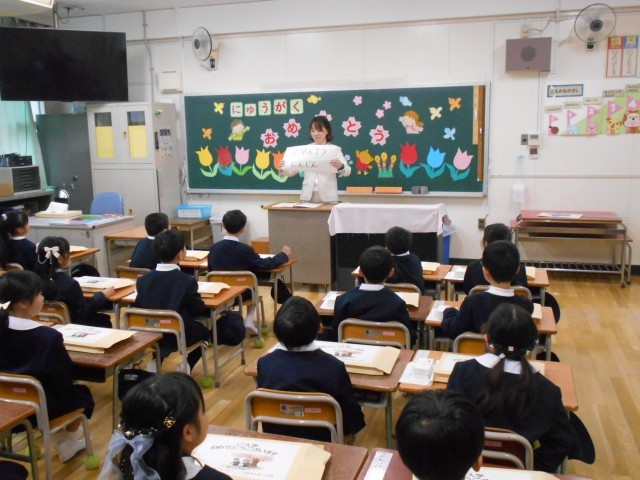 教室では担任の先生とあいさつをしたり、クイズをしたりしました。