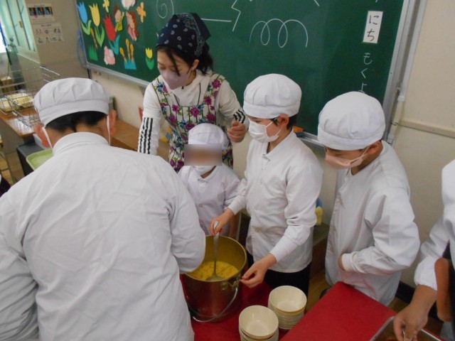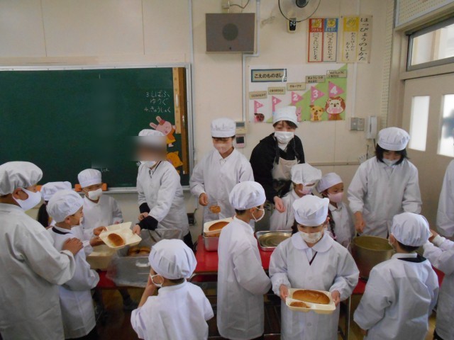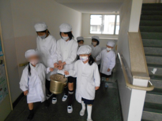 しばらくの間、6年生が1年生の給食の配膳を手伝います。