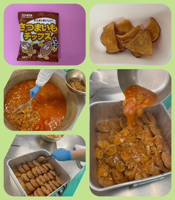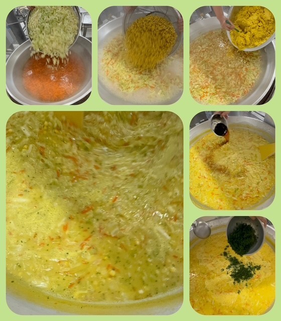 「コーンスープ」は、キャベツ、コーンペースト、コーン(冷凍)、にんじん、パセリを使用し、チキンブイヨン、塩、こしょう、薄口しょうゆなどで味つけします。