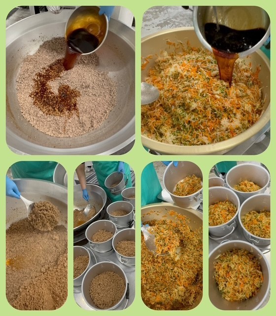 「ビビンバ(野菜)」は、きゅうり、にんじん、切干しだいこんを焼き物機で蒸し、砂糖、塩、濃口しょうゆ、ごま油、煎ったいりごまで作った調味液をかけ、あえます。