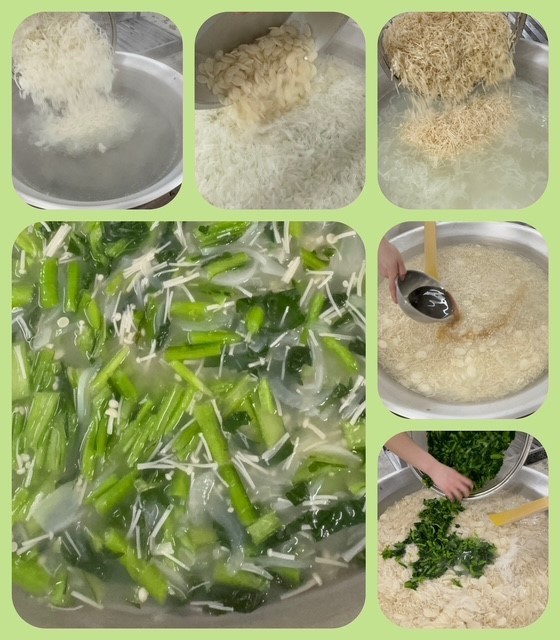 「トック」は、トック、たまねぎ、えのきたけ、青みにこまつな(冷凍)を使用し、塩、こしょう、薄口しょうゆ、中華スープの素などで味つけします。