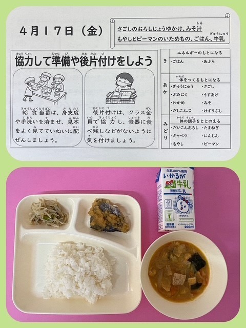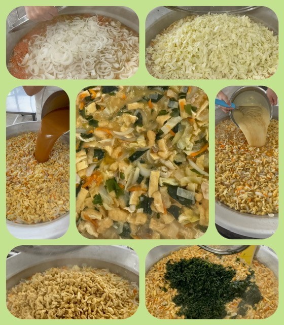 「みそ汁」は、豚肉、にんじん、たまねぎ、キャベツ、うすあげ、わかめ(乾燥)を使用したみそ汁です。