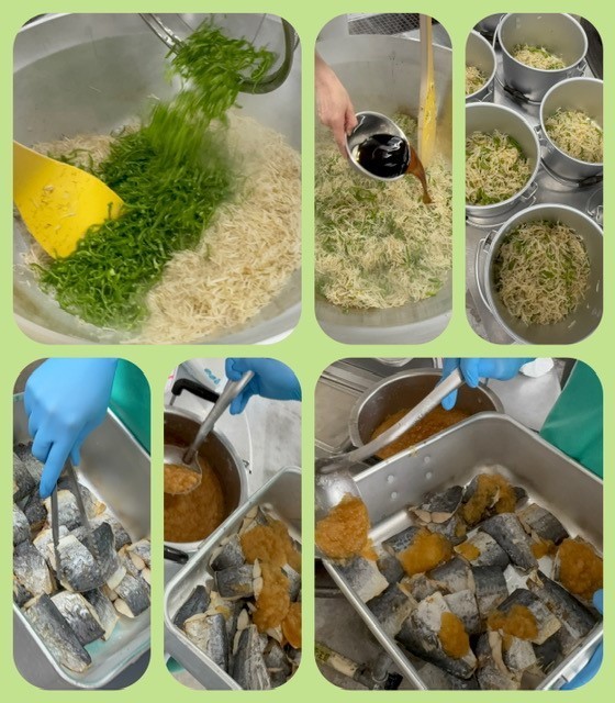 「さごしのおろしじょうゆかけ」は、焼き物機で焼いたさごしに、だいこんおろし、みりん、薄口しょうゆで作ったタレを配缶時にかけます。