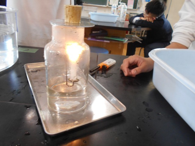 集気びんの中に入れた火がすぐ消えると、「あれっ」という声や、勢いよく燃える様子をみて、「おお~」という声があがっていました。