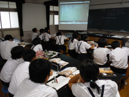 大雨のときの川の水は濁っていました。石や砂,泥が流されてようすを図示したノートを,教材提示装置で見ました。大雨のときには,水中を石や砂が転がるように流れているのかな?これから学習していきましょう!