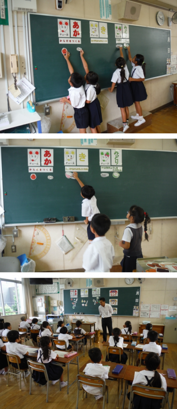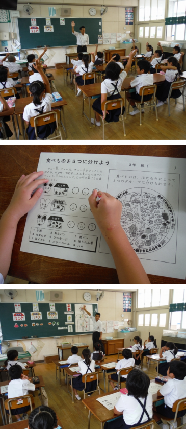 さまざまな食べ物が,どのグループになるかグループ分けをした後,体の中でそれぞれの食べ物がどのように体をつくっていったり,体の調子を整えたりしているか話を聴きました。