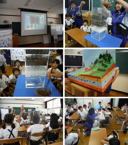 水は循環していることを立体模型(水蒸気が雲になり,雨を降らし,川から海に流れていく)を使って説明していただきました。水のろ過では,落ち葉混じりの茶色い水がフィルターを経てきれいになっていく様子を観察しました。