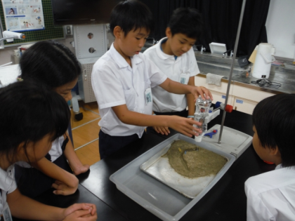 今日は,曲がった川に水を流したときの水の流れや流れた後のようすを調べました。