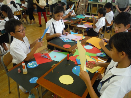 月曜日の中秋の名月や火曜日のスーパームーンを見た人がたくさんいたことでしょう。そんな美しい月や宇宙の惑星,パソコンで調べた宇宙の様子や星座を画用紙などの紙類で作り自分の宇宙を表現しました。