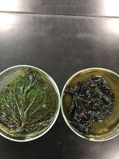 日光に当てた葉と当てていない葉、それぞれを茹でで柔らかくし、ヨウ素液の反応を確認しました。日光を浴びた方はデンプン反応が見られ、青むらさき色に変化しました。