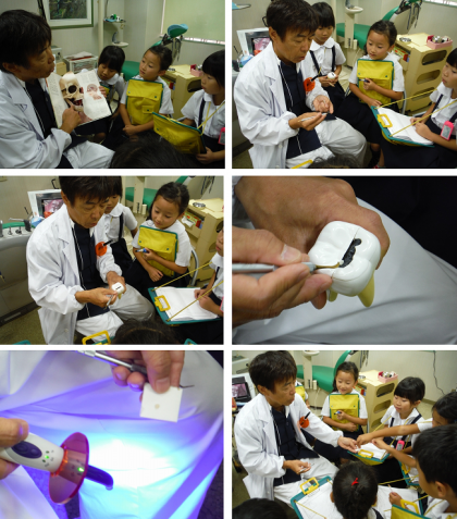 虫歯かどうかを検査する機械,虫歯を削る機械,虫歯に詰め物をするための機械などがあります。歯を削った部分にやわらかいプラスチックを乗せ,紫外線をあてると硬くなるようすも模型を使ってわかりやすく教えてもらいました。