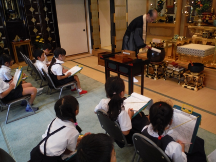 住職さんから,仏様をお祀りしている場所を「本堂」ということや,入口には「山門」があることなど,神社とお寺とのちがいもわかりやすく話していただきました。また,お経についてやお寺で使う道具なども教えていただきました。