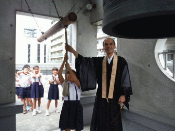 圓乘寺にも鐘があります。毎月開いている法要のときや除夜の鐘を鳴らしています。今日は特別に,屋上にある鐘を突かせてもらいました。