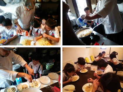 昔は麺は手でこねていましたが,今はパスタマシーンでこねていますが,お店の手づくりの生パスタです。普通は15cmほどで切りますが,今日は『豊崎一長い麺をつくろう!』とチャレンジしました。とても長い麺ができあがり,子どもたちも驚いていました。
