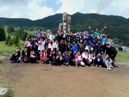 高原の中央にあるモニュメントで記念写真です。真向かいの氷ノ山に向かってやまびこ体験。「ヤッホー」