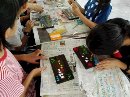 ハチ高原に来てからのイメージや部屋飾りのデザインを昨日磨いた焼き板に描いていきました。いいお土産ができました。