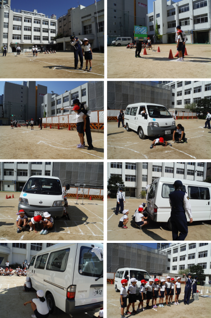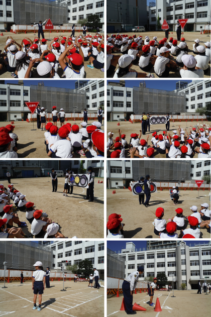 この後,安全な歩行の仕方を教えていただき,運動場に引いた横断歩道や道路を実際に歩きました。