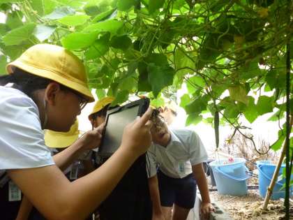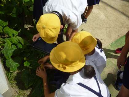 一学期に学習したアブラナの花のつくりや育ち方を復習し、ヘチマやカボチャはどのように実ができるのかを調べるため、校内の花の観察をしました。